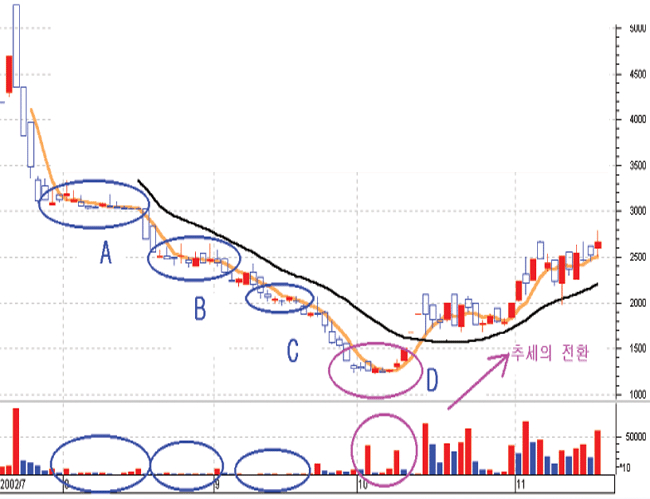 추세가 바뀌기 위해선 거래량의 변화가 있어야 한다는 강의를 했습니다. 초보 투자가들이 흔히 실전에서 실수하기 쉬운 부분이 하락하던 주가가 더이상 하락하지 않는 하방경직을 보인다고 덥썩 매수하게 되는 경우입니다. 즉, 하락하던 주가가 옆으로 횡보하면 이제 바닥인가보다고 섣부르게 판단하여 매수를 하게 된다는 점입니다. 그러나 하락하던 주가가 상승으로 전환하기 위해선 차트상 여러가지 변화가 나오게 마련인데(20일선 돌파, 쌍바닥, 짝궁뎅이, 거래량 증가 등), 이러한 추세전환의 신호를 확인하지 않고 성급히 매매를 한다면 그야말로 조금 더 먹으려다 큰 손해를 보는 소탐대실의 실패를 하게 됩니다. 안전하고 확률 높은 매매를 하기 위해선 조금 덜 수익이 나더라도 이러한 추세전환 신호들을 확인하고 매매하는 습관을 가져야 합니다. 밑의 종목을 예로 들면 A와 B, 그리고 C지점에서 주가가 옆으로 횡보하면서 하방경직을 보였습니다. 그러나 이때는 아직 매수의 시기가 아닙니다. 그 이유는 20일선 돌파도, 쌍바닥도 짝궁뎅이도 없었을 뿐만 아니라 가장 중요하면서도 상승의 에너지라 할 수 있는 거래량의 변화가 없기 때문입니다. 즉, 이 시점은 추세전환의 신호가 없으므로 매매를 해선 안되는 시점인 것입니다. 그러나 D지점에서는 비록 쌍바닥은 아니지만 앞서와는 다르게 옆으로 횡보하는 기간중 거래량의 변화가 확연함을 알 수 있습니다. 바로 이 시점이 바닥이라고 판단하고 과감히 매매를 해 볼수 있는 시기가 되는 것이고, 매수 이후에는 거래량이 터진 그 가격대를 깨는지 안 깨는지를 지켜보다가 안 깨지면 지속 보유하고 깨지면 손절매하는 전략을 구사해야 하는 것입니다.
