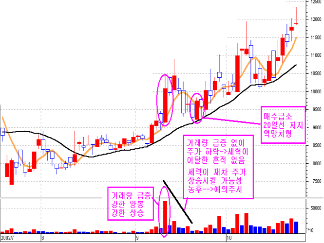 거래량이 급증하면서 강한 양봉이 나온 경우는 호재성 뉴스에 의한 경우를 제외하고 대부분 수급적인 측면에서 세력이 개입되었다고 봐야 합니다. 즉, 거래량이 급증하면서 상승한 종목은 단기 세력이든 장기 세력이든 세력이 강하게 매수를 해주었다는 의미가 되는데, 들어온 세력이 이익실현을 하고 빠져나가지 않은 것으로 보이는 종목의 주가가 하락한다면 일단 관심을 갖는 것이 좋습니다. 그 이유는 매물을 먹으면서(거래량 증가) 주가를 상승시킨 세력은 자신이 빠져나가지 않은 상태에서 주가가 하락한 경우에 다시금 주가를 상승시키려는 경향을 보일수 밖에 없기 때문입니다. 그런데 여기서 중요한 것은 주가를 상승시킨 세력이 빠져나갔는지 아닌 지를 판별하는 게 사실 쉽지가 않다는 점입니다. 그러나 실전에서 보면 대체로 거래량이 급증하면서 장대양봉이나 상한가를 만든 종목이 이후 거래량 터진 음봉 없이 주가가 밀렸다면 일단 세력이 잔존해 있는 것으로 보는 것이 좋습니다. 왜냐하면 거래량을 급증시키면서 들어온 세력은 대부분 거래량을 다시 급증시키면서 빠져 나가는 것이 일반적이기 때문입니다. 그리고 이런 종목을 관심있게 보다가 20일선, 전저점 같은 지지선에서 주가가 지지받는 것이 확인되면 매수에 동참하는 것이 효과적인 매매가 된다고 할 수 있습니다.