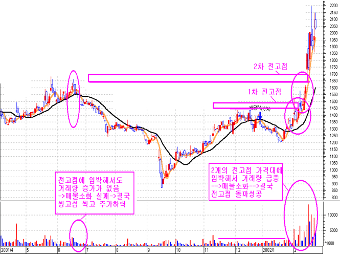 자동차가 가파른 언덕길을 오르기 위해선 언덕 아래 부분을 달릴 때보다 엑셀레이터를 더 많이 밟아주어야 한다는 것을 모르는 분은 없습니다. 즉, 언덕길을 오르기 위해선 더 많은 에너지가 필요하게 되는 것이지요. 마찬가지로 주가차트에서 언덕에 해당되는 전고점을 돌파하기 위해선 평상시보다 더 많은 에너지 즉, 거래량 증가가 필요하게 됩니다. 통상 고점에서 물려있던 사람은 밀렸던 주가가 다시 그 가격 근처에 오면 "죽다 살았네"하는 심정으로 고점 근처에서 매도하는 게 일반적입니다. 그래서 전고점 가격대에 주가가 근접하면, 바닥에서부터 매수하여 이익이 난 이익실현 매물과 전고점에 물려있는 이전의 악성매물이 강하게 나오기 때문에 전고점을 돌파하기 위해선 이러한 매물보다 더 큰 매수세가 들어와야 하는 것입니다. 이러한 강한 매수세와 매물간의 치열한 싸움으로 인하여 전고점을 돌파하는 시점에서는 통상 거래량이 급증하는 게 일반적입니다. 그러므로 전고점에 임박해서도 거래량의 증가가 없을 경우엔 쏟아지는 매물을 이기지 못하고 결국 주가가 쌍고점을 찍고 하락하게 된다고 할 수 있습니다. 그러나 어떠한 경우에는 전고점에 임박해서 거래량의 증가가 없는데도 주가가 밀리지 않고 오히려 상승하는 경우가 있습니다. 이 부분에 대해선 다음 강의에 자세히 설명하도록 하고 오늘은 일단 전고점에 임박해서 거래량이 늘어야 전고점을 돌파할 수 있는 에너지가 생긴다는 점을 잊지 마시기 바랍니다.