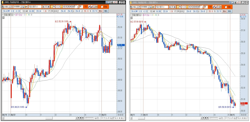 왼편은 4월 22일 원웨이 상방 오른편은 4월 12일 원웨이 하방