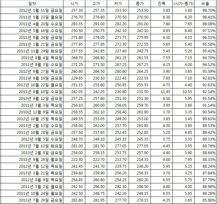 시가와 종가차이가 일 변폭의 75% 이상인 날로 정의 했다.