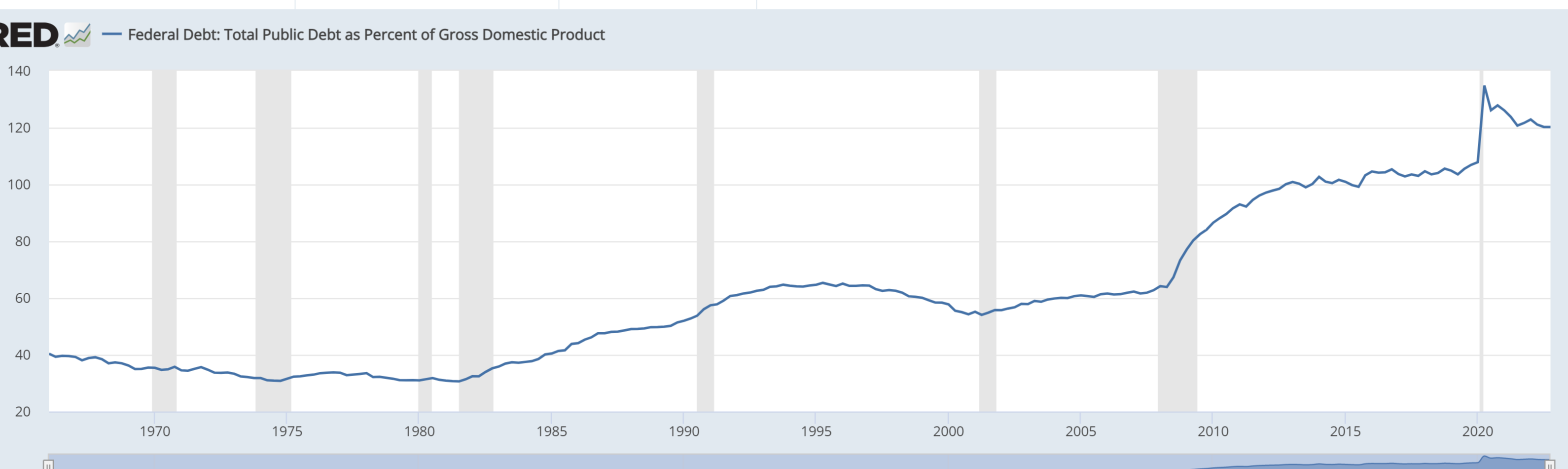 미국 인플레가 안 잡히는 이유 중 하나가 미국 정부 지출이 충분히 줄지 않기 때문입니다. 2000년 코로나 팬데믹 이후 경기 부양으로 늘었던 미국 정부 부채의 미국 국내 총생산 비율이 아직도 100%가 넘어 높습니다. 따라서 인플레가 2% 가까이 떨어지는 것이 보이기 전까지는 미국 정부 지출을 동결 내지 꼭 필요한 범위 내에서 소폭 인상하는 것이 필요하다고 봅니다. 이번주 막바지까지 벌어질 미국 정부 부채 한도 협상에서 공화당은 미국 정부 셧다운 가능성을 배제 하지 아니하고 내년 미국 정부 지출 동결을 주장합니다. 인플레 억제를 위하여서는 그 것이 맞다고 봅니다. 다만 민주당이 주장하는 부자 증세도 시행하는 것이 맞는데 그 부분은 공화당이 결사적으로 반대합니다. 이번주 막바지 협상 과정까지 미국 증시는 횡보할 가능성이 높다고 봅니다. 만약 미국 정부 셧다운이 일어날 경우 2011년 처럼 증시가 20% 정도 까지 조정받을 수 있기 때문입니다.