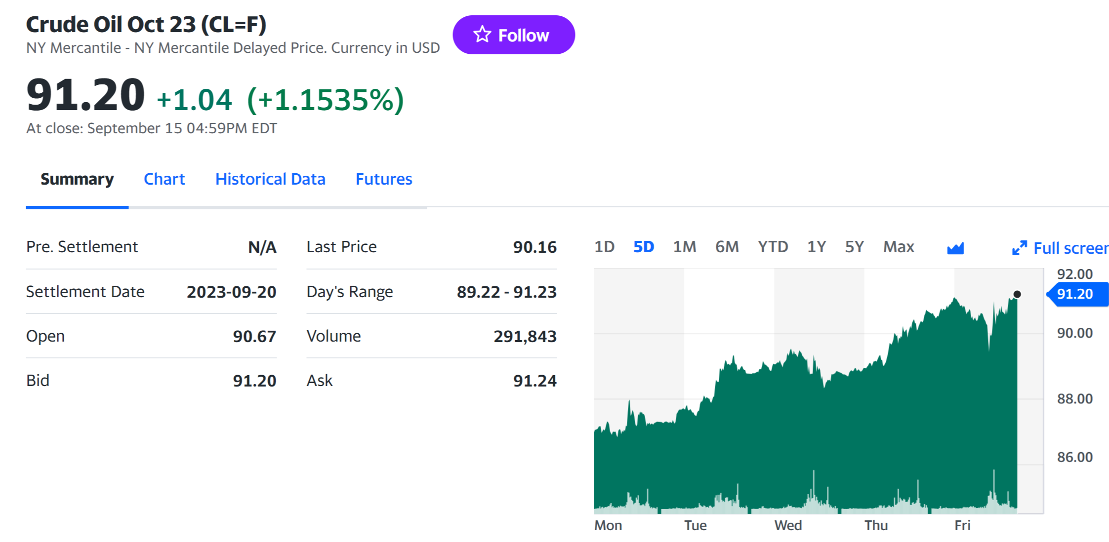 지난주 유가 선물은 상승세를 유지하여 90불을 넘어 조만간 100불을 넘을 수도 있다는 예측이 나옵니다.선물이다 보니 하방에 베팅한 측에서 솟커버가 들어 오면 그럴 가능성이 충분히 있습니다. 사우디와 러시아가 감산 기간을 연장하여 유가 상승을 주도하고 8월 중국 소비자 생산 지수가 예상보다는 높게 나온 것도 원인이 되었습니다. 리비아 항만 도시가 폭우와 댐 붕괴로 무너진 것도 도움이 안 되었습니다. 다만 유가가 너무 올라 가면 경기 침체를 일으켜 멀리 보아서는 다시 유가 하락 원인이 되는 점과 바이든 행정부가 유가 하락을 위한 반전 카드로 이란과 헙상을 서두를 수 있어 연말 유가가 100불 넘어 마감하기는 어렵다는 의견도 있습니다. 미국 소비자 물가 지수에 에너지는 7% 밖에 안 되지만 운송 및 건설 비용 상승에 의한 주택가격 상승을 일으킬 수 있다는 점에서 바이든 행정부가 내년 대선을 앞 두고 대책을 강구하고 있을 것입니다.