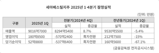 [파이낸셜뉴스] 세아베스틸지주는 올해 1·4분기 연결 기준 매출 9017억원, 영업이익 181억원의 잠정실적을 기록했다고 29일 공시했다. 전년 동기 대비 매출은 5.4%, 영업이익은 15.0% 줄었지만, 전분기 대비로는 흑자 전환에 성공했다.