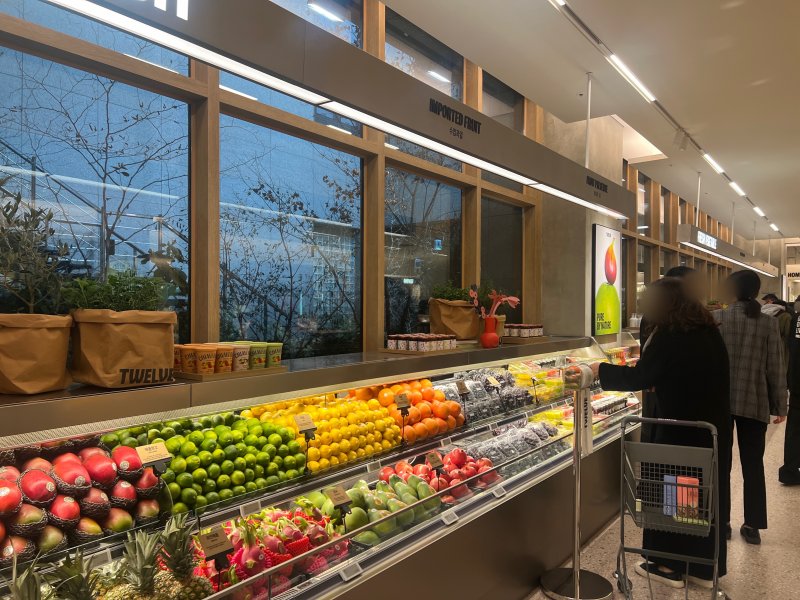 매장에서 흘러나오는 생동감 있는 음악과 색·질감을 강조한 디스플레이 등 감각적 연출 방식도 기존 식품매장과의 차별점이다. 색감별로 정리된 채소와 과일은 비포장 상태로 배치해 고객이 직접 친환경 비닐에 골라 담아 구매할 수 있도록 했다.