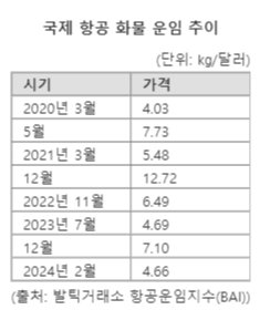 10일 발틱거래소 항공운임지수(BAI)에 따르면 지난달 홍콩-북미 노선 항공 화물 운임은 1㎏당 4.66달러로 2020년 3월 4.03달러 이후 최저치를 기록했다. 불과 2달 전인 지난해 12월(1㎏당 7.1달러)과 비교하면 34.4% 급락한 수치다.