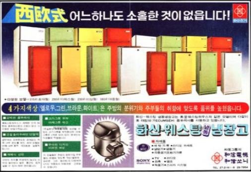 화신전기와 손잡고 냉장고를 한국 시장에 출시한 적이 있다. 두 기업은 1960년 화력발전소 건설을 추진한 적도 있다. 냉장고 이름은 '화신-웨스팅하우스 냉장고'(경향신문 1976년 3월 17일자·사진). 광고에 나와 있듯이 미국에서 판매되던 제품과 같은 것이었다. 다양한 색상의 컬러 냉장고는 파격적이었다. 가전제품 보급이 폭발적으로 늘어날 당시에는 백색가전이라는 말 그대로 냉장고는 다 흰색이었다.