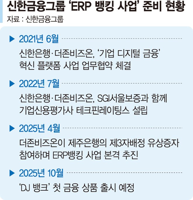 2022년 7월 신한은행과 더존비즈온은 SGI서울보증과 함께 기업신용평가사 테크핀레이팅스를 설립했고, 올해 4월에는 더존비즈온이 신한금융 계열사 제주은행의 제3자배정 유상증자에 참여하며 ERP뱅킹 사업을 본격 추진해왔다.