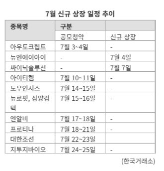 LG씨엔에스, 아이에스티이, 나우로보틱스 등이 상반기에 상장한데 이어 7월에는 에이유브랜즈, 삼양컴텍, 지투지바이이오 등 다양한 기업들이 상장을 준비 중이다.이 외에도 2022년 한 차례 상장을 추진했다가 철회했던 삼진식품이 재도전에 나섰고, 6월 한 달에만 4개 신규 스팩(SPAC)이 예비심사를 청구하는 등 다양한 경로의 IPO 추진이 이어지고 있다. 지난 24일에는 인공지능(AI) 빅데이터 분석 전문기업 에스투더블유(S2W)와 자동차 경량 부품업체 한라캐스트도 코스닥 상장을 위한 예비심사를 통과했다.