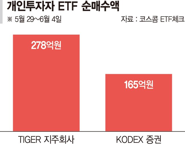지주회사를 비롯해 개인 투자자는 이재명 정부 출범에 따라 정책 수혜 기대감을 받는 ETF를 순매수하고 있다. 개인은 최근 일주일 간 삼성자산운용의 'KODEX 증권'을 165억원어치 사들였다. 전체 국내 ETF 중 순매수 6위에 해당한다.