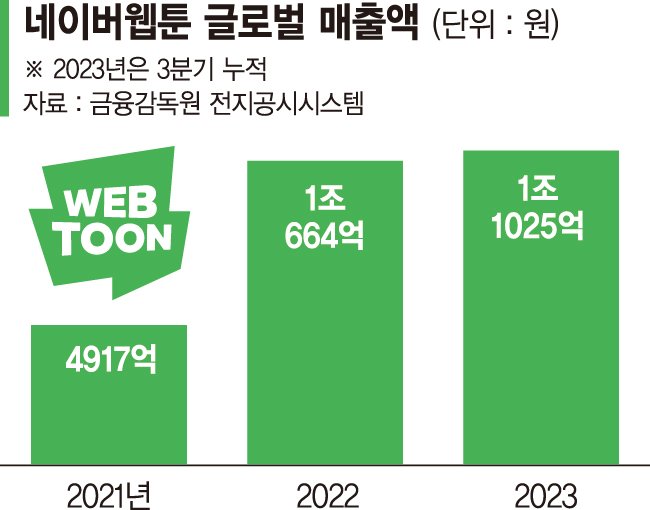 한국투자증권 정호윤 연구원은 "웹툰엔터테인먼트의 올해 매출 추정치는 약 1조6000억~1조7000억원 수준이다. 이를 기반으로 적정가치는 약 4조8000억~5조10000억원"이라며 "네이버의 지난해 웹툰 거래액 성장률이 12.2%로 낮아졌다는 점에서 기업공개(IPO)를 통해 확보한 자금으로 흥행 가능한 지식재산권(IP) 발굴 등 장기 성장 기틀을 마련할 필요가 있다"고 진단했다.