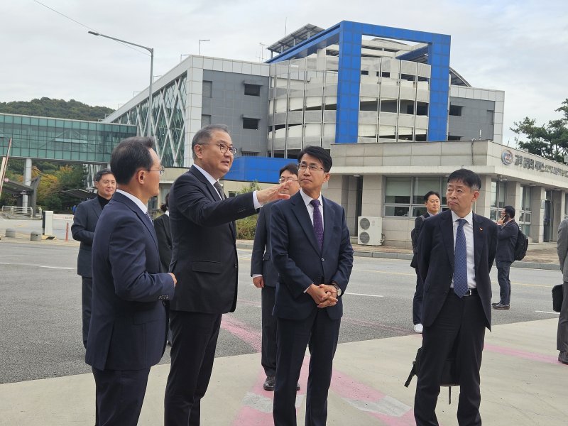 | 21일 서울시 강서공영차고지 수소충전소에서 박상욱 대통령실 과학기술수석(왼쪽)를 비롯한 관계자들이 수소버스 전환사업에 대한 이야기를 나누고 있다. 사진=박지영 기자 |