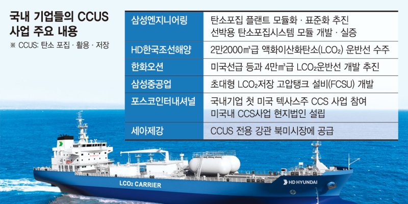조선·철강·에너지 등 국내 중후장대 기업들을 중심으로 탄소 포집·활용·저장(CCUS) 사업 경쟁이 뜨거워지고 있다. 이들 기업은 글로벌 환경 규제에 대응하는 선제적인 탄소 포집·저장 기술 상용화 및 프로젝트 개발로 미래 시장을 주도한다는 전략이다.