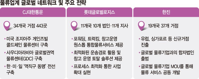 22일 업계에 따르면 CJ대한통운, 한진, 롯데글로벌로지스 등 국내 물류업체는 공격적으로 해외 물류 인프라 구축에 나서고 있다.