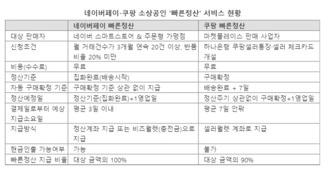 [파이낸셜뉴스]소상공인에게 판매대금을 빠르게 정산해 자금융통을 돕는 '빠른정산' 서비스 경쟁이 격화되고 있다. 네이버파이낸셜(네이버페이)이 2020년 12월부터 빠른정산 서비스를 시작한 지 3년 만에 하나금융과 쿠팡이 손을 잡고 비슷한 서비스를 내놓으면서다.