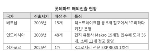 한편, 롯데마트는 지난 2008년 인도네시아와 베트남에 진출한 이래 총 63개 점포(인니 48개, 베트남 15개)로 사업을 확대했다. 특히 한국에서 성과를 거둔 그로서리 전문 매장을 접목한 결과 이들 국가에서 지난해 매출액과 영업이익은 각각 3.0%, 19.6% 증가했고, 올해 1·4분기에도 매출 9.5%, 영업이익 20.6%의 성장세를 이어가고 있다.