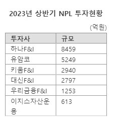 한편 올해 상반기 NPL 투자는 누적 기준 하나F&I가 8459억원으로 1위다. 다음으로 유암코(연합자산관리) 5249억원, 키움F&I 2940억원, 대신F&I 2797억원, 우리금융F&I 1253억원, 이지스자산운용 613억원 순이다. 하나F&I는 올해 초 NPL 투자 평잔 2조원 목표를 세웠는데 이를 이미 초과 달성한 것으로 알려졌다.