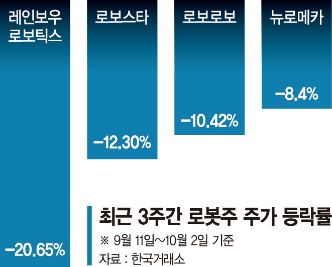 유진투자증권 연구원은 "로봇주가 두산로보틱스 상장 기대감, 대기업들의 로봇시장 진출 소식 등에 단기간 급격히 오르면서 차익실현에 대한 수요가 커졌다"며 "대표적인 성장 섹터로 단기적 변동성이 큰 만큼 주가에 대한 투자자들의 피로감, 부담감 등도 조정을 이끈 요인"이라고 말했다.