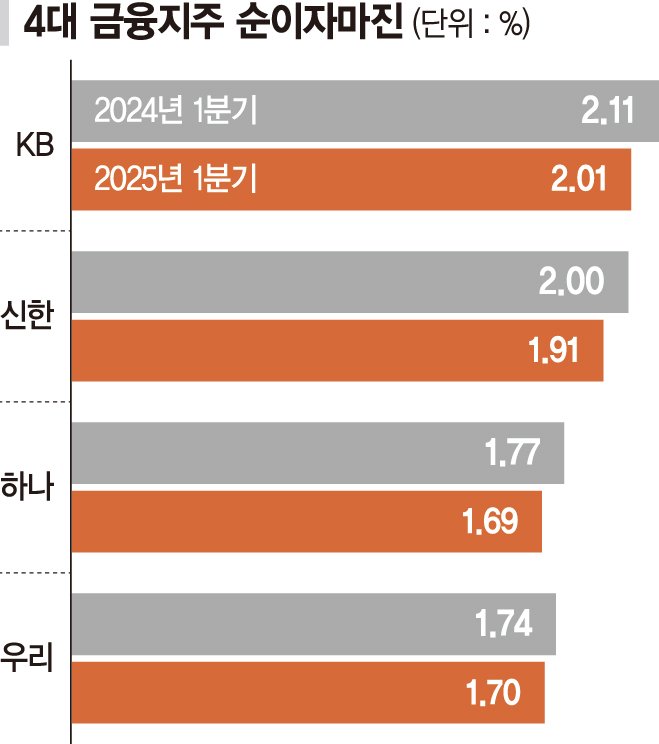 KB금융의 NIM은 지난해 1·4분기 2.11%에서 올해 1·4분기 2.01%로 떨어졌고, 신한금융(2.0%→1.91%), 하나금융(1.77%→1.69%), 우리금융(1.74%→1.7%)도 낮아졌다.