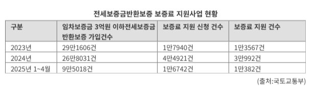 특히 전세반환보증 가입건수 대비 보증료 지원사업 신청건수는 현저히 낮다. 지원사업의 대상이 되는 임차보증금 3억원 이하에 대한 전세보증금반환보증 가입건수는 2023년 29만1606건, 2024년 26만8031건, 2025년 1~4월 9만5018건으로 꾸준히 수요가 있었다.