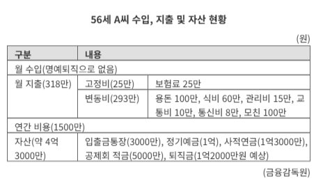 56세 A씨는 명예퇴직을 결정해 정기적인 월 수입은 없는 상황이다. 월 지출은 318만원이다. 고정비는 보험료 25만원이 나간다. 변동비는 용돈(100만), 식비(60만), 관리비(15만), 교통비(10만), 통신비(8만), 모친(100만) 등 293만원이 든다. 연간 비용은 1500만원이 나간다. 자산은 입출금통장(3000만), 정기예금(1억), 사적연금(1억3000만), 공제회 적금(5000만), 퇴직금(1억2000만 예상) 등 약 4억3000만원이다.