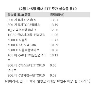 이 기간 ‘SOL 자동차TOP3플러스’(13.79%), ‘1Q 미국우주항공테크’(12.50%), ‘TIGER 현대차그룹+펀더멘털’(11.96%), ‘KODEX 자동차’(11.72%)가 상위권에 올랐다. 자동차 부품, 전장, 자율주행 등 자동차 전방산업 전반으로 상승세가 확산됐다.