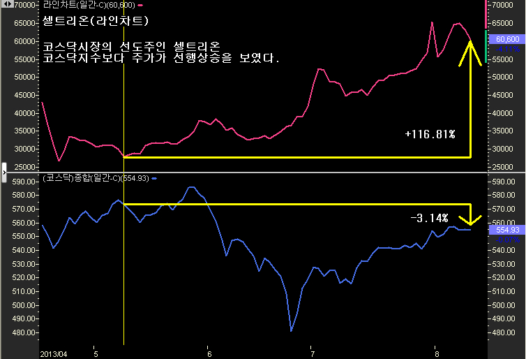 위의 그림에서 알수 있듯이 같은 기간 코스닥지수가 - 3.14% 하락한데 비하여 코스닥시장의 시가총액 1위기업이면서 코스닥지수 상승을 주도한 셀트리온은 +116.81%의 높은 상승률을 기록한 것을 알수 있다.