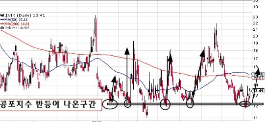 공포지수가 바닥에서 상승을 시작하면 주식시장은 변동성이 커지게 된다.