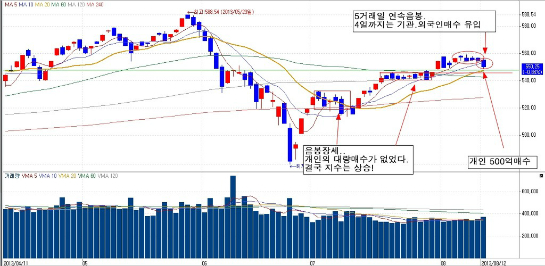 코스닥은 5거래일 연속 음봉이 출현하고 있는데 금일은 개인의 매수가 500억을 넘어섰다. 그전까지는 음봉이 출현해도 외국인과 기관의 매수가 유입되어 큰 부담이 없었지만 금일은 소폭 부담되는 모습으로 마감되었다.