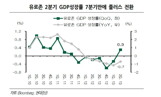 유로존 2분기 GDP 성장률이 시장 예상치보다 높은 0.3% 상승으로 나타났다. 6분기 연속 마이너스 성장에서 벗어나며 강력한 턴어라운드를 이뤄냈다는 점에서 의미가 높다. 또한 유로존 위기 당시의 핵심 주역였던 스페인, 이탈리아, 포루투칼의 2분기 GDP 성장률이 크게 개선되었다는 점에서 이 같은 추세는 일시적 현상은 아닌 것으로 보인다. 9월 독일 총선을 전후로 ECB의 통화 확장 정책이 실시될 가능성이 높다는 점도 추가적으로 힘을 실어준다.