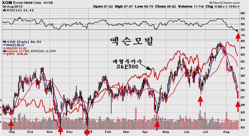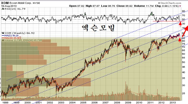 기술적으로 엑슨 모빌은 2007년 고점 이후 수년에 걸친 강력한 매물대 지지권에서 움직인다. 따라서 하락이 더 이어질 공간이 크지 않으며 상승을 목전에 두게 된다. 2007년 이후 6년에 걸쳐 매물대가 가장 두텁게 지지가 되는 탄력을 비축했다는 점에서 이후의 상승은 장기 추세로 가기 쉬우며 10년을 두고 반복하는 경기 주기를 적용하면 2003년~2008년에 나타났던 장기 상승 추세가 다시 반복하여 나타날 시기이다.