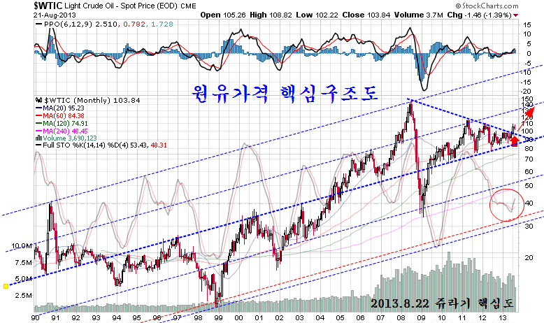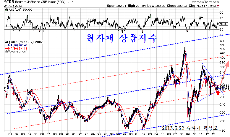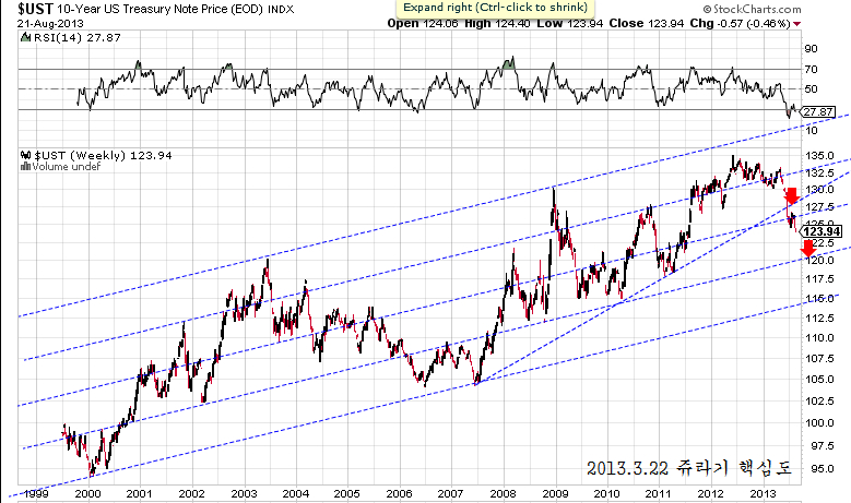 양적완화로 국채 가격이 하락하지 않도록 유지해왔으나 양적완화 축소가 예정되면서 추세 하락, 핵심도의 중심 추세 이탈로 채널 둘째 선을 목표로 추가 하락의 여지가 있으며 4등분된 채널 중 둘째 칸에서 박스권 등락 예정.