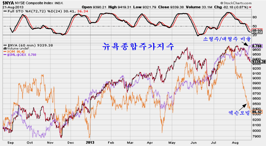 옵션 만기가 끝나고 소형주/대형주 비율이 상승으로 움직이고 있으나, 뉴욕 종합지수는 엑슨모빌의 하락의 영향을 받아 조정을 이어가면서 이머징 마켓 지수 상승을 억제하여 매집 기회로 삼고 있으나, 엑슨모밀의 9일 연속 하락과 함께 중기 상승 추세 전환의 시점 임박.