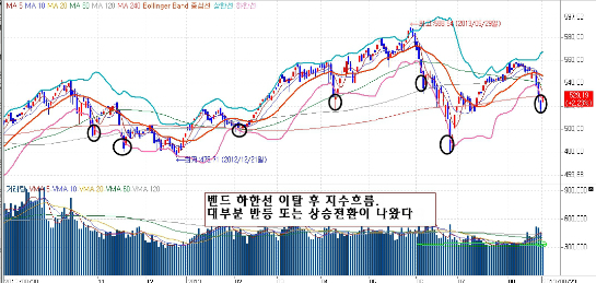 지난 목요일 코스닥 지수는 밴드하한선을 완벽하게 이탈했다.(하한선과 3%이격발생)