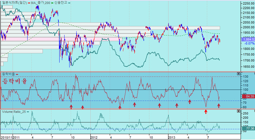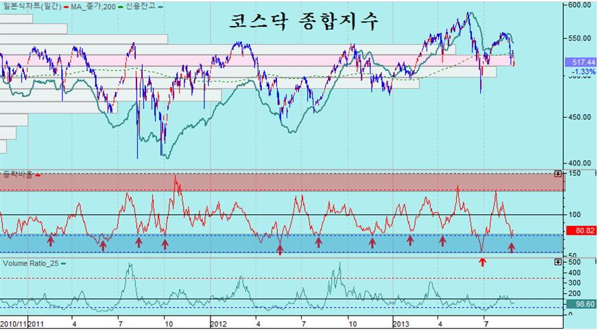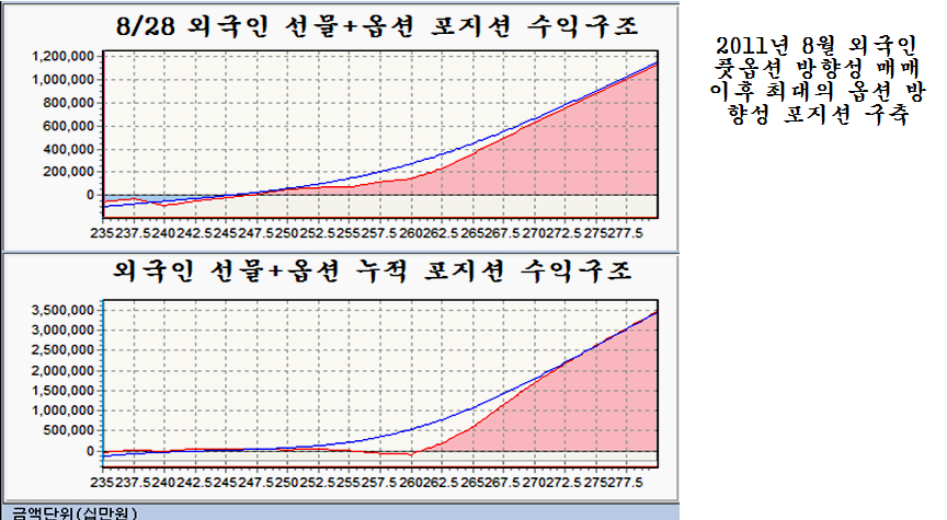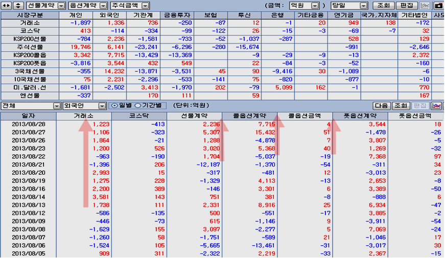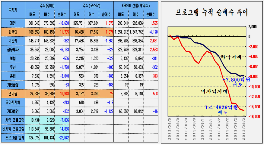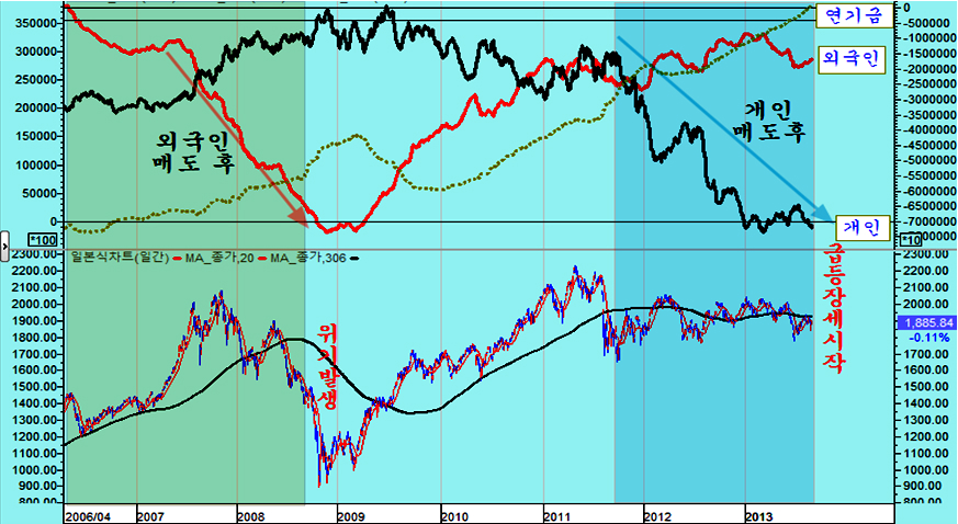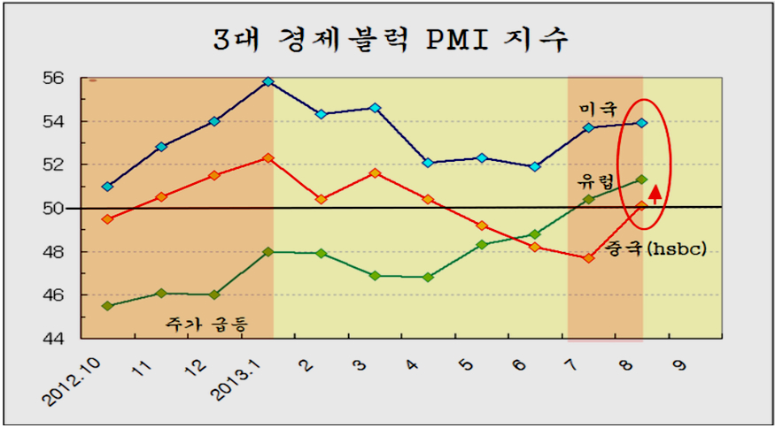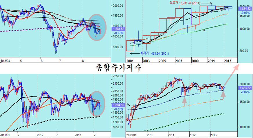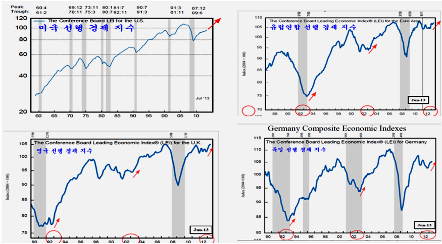 최근 인도나 인도네시아 브라질의 환율 상승과 함께 세계 주요 금융 언론을 통해 오늘도 시리아 공격 임박에 대한 우려로 개인이 1897억의 경계 매물을 쏟았으나 외국인은 1336억의 주식을 순매수하며 연기금과 경쟁을 하듯 개인과 여타 기관의 매도 물량을 쓸어 담았고, 선물 2236계약, 콜옵션 매수 등 주가 상승에서 수익을 얻는 포지션을 적극 확대하고 있다. 27의 경우 외국인은 1055억의 주식을 순매수 한 것으로 나타났으나 실제로는 이보다 많은 매수를 하였다. 왜냐하면, 차익 프로그램 449억원과 비차익 프로그램 758억원 등 1207억원의 프로그램 매도하였으므로 실제 일반거래 순매수 물량은 2200억 원에 달하다. 즉, 프로그램 매도를 통해 지수를 하락시키면서 낮은 단가로 실제 투자 계좌로 주식을 옮겨 담는 과정으로 볼 수 있다. 특히 8월 1일 이후 지수가 1900선 아래에서 조정을 거치는 동안 프로그램 거래는 차익거래 7,806억원 순매도, 비차익거래 1조 4,836억원 순매도로 도합 2조 2642억원 순매도를 했으나, 프로그램 거래 중 외국인 비중을 볼 때 이 물량 역시 대부분 외국인이 매도했다고 볼 수 있다. 따라서 8월 1일 이후 외국인이 1조 1795억원의 순매수와 연기금 1조 948원의 순매수를 한 것으로 나타나 있으나, 외국인은 프로그램 매도 분을 감안하면 일반거래로는 3조원 가까운 순매수를 하고 있음을 나타낸다. 이뿐이 아니다, 선물 옵션 포지션을 보면 260 이상의 외가격 포지션에 대해 대단히 공격적인 포지션을 취하고 있다. 외국인이 옵션에서 이처럼 방향성이 강한 포지션을 취하는 경우가 매우 드물다. 결론적으로 외국인은 한편으로는 이것은 과거 2008년 위기를 보면, 위기가 발생하기 전인 2008년 6월 말까지 외국인은 처분하기 위한 물량의 90%를 이미 매도한 후에 9월 실제 위기가 발생하였다. 정보가 정확하고 빠르며 금융시장 장악력이 강한 외국인은 위기가 발생할 때 먼저 주식을 매도하여 위험 관리하는 것은 자연스럽다. 그러나 2011년 하반 위기 국면 이후에는 외국인은 주식 비중을 줄이지 않고 개인이과 개인의 투자인 투신이 집중적으로 주식 비중을 줄였다. 대신 개인이 판 주식은 외국인과 연기금 및 보험이 매수를 하고 있다. 따라서 외국인이 주식을 대부분 매도한 후 주가가 급락하는 위기가 되었다면, 개인이 주식을 대부분 매도한 후에 나타나는 장세는 위기라 아니라 급등장세이어야 한다. 이것은 장세의 기본이다. 이런 맥락에서 외국인의 최근 매매를 보면 이해하기 쉽다. 브라질, 러시아, 인도, 중국 등 브릭스(BRICs)을 포함한 한국 등 신흥공업국이 최근 위기론의 진앙이다. 그러나 이들 나라 주가는 2011년 이후 줄곧 하락하여 상대적인 가격수준으로 볼 때 위기에 의한 하락의 바닥에 있는 것과 같다. 그 동안 세계 경기가 둔화되면서 선진국의 주가는 꾸준히 오른 반면에, 이들 신흥공업국 주가는 하락을 이어갔다. 왜냐하면 경기에 민감하지 않은 3차산업 중심의 선진국은 세계 제조업 경기 둔화에도 불구하고 성장이 이어졌지만, 3차 산업보다는 경기에 민감하게 반응하는 제조업을 중심으로 하는 신흥공업국은 그간 상대적으로 경기가 더 어려웠기 때문이다. 따라서 경기나 주가나 신흥공업국이 상대적으로 약세로 나타나는 것은 무리가 없다. 그런데 최근 2년 동안 둔화과정을 겪었던 세계 제조업 경기가 회복되는 움직임이 나타나고 있다. 세계 경제의 1, 2, 3위를 점하는 미국과 유럽연합과 중국의 제조업 구매자관리지수가 모두 50을 넘어서며 회복의 양상이 뚜렷하다 이와 함께 원유, 철강, 해운운임, 금속 등 제반 원자재 가격이 5년 저항을 돌파하여 상승으로 움직이고 있다. 원자재의 상승은 세계 경기의 회복에 의한 수요 증가가 아니면 가격 상승을 예상하기 어렵다는 점에서 이미 경기 지표로 나타나고 있는 세계 경기의 회복이 실물 시장에서 미리 반영된 것이라 할 수 있다. 한편, 세계 경제를 리드하는 미국과 유럽연합 중국의 경기 선행지수를 보면 2년간 둔화되던 경기선행지수가 회복기미가 완연하다. 특이 이들 나라의 선행지수를 분석해 보면 1992~1993년, 2002~2003년 선행지수 상승 이후 5년에 걸친 견실한 성장이 나타나 10년 주기의 주글라 경기 파동이 뚜렷이 나타난다. 따라서 2012년 ~ 2013년 조정을 거쳐 회복되는 경기는 과거 1993~1998년, 2003~ 2007년에 걸쳐 지속되었던 것처럼, 2013년~2018년에 걸쳐 계속되는 시작임을 알 수 있다. 세계 경기가 이렇게 움직이는 흐름이라면, 경기에 민감한 신흥공업국은 지금까지는 최악의 경기침체와 주가 상대적 하락을 겪었으나, 앞으로는 경기에 둔감한 서비스업 비중이 높은 선진국보다 경기도 빠르게 성장하고 주가도 더 앞서서 올라야 함을 의미한다. 이런 시점에서의 세계를 움직이며 투자하는 글로벌 메이저 전략은 적극적인 신흥공업국의 주식 비중을 늘리는 것일 수 밖에 없고, 이를 위해서는 위기론을 최대한 선전하여 매물을 유도하고, 환율을 가급적 높게 올려서 달러의 구매력을 키우는 전략을 가져갈 수 밖에 없다. 이런 맥락에서 최근의 위기론과 그 와중에 외국인의 주식 매수를 이해할 수 있다. 이런 전략에서 나온 것이 최근의 신흥공