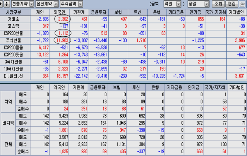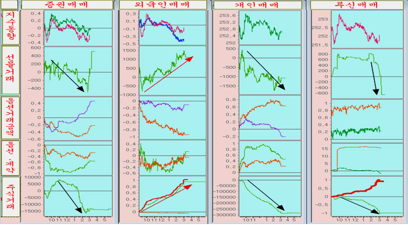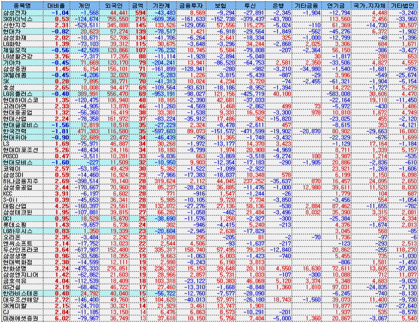 실제 kospi 200기업을 중심으로 외국인은 활발한 매수를 하였으나, 기관의 매도가 큰 지수 대형주가 하락함으로써 전체 지수는 크게 오르지 못하고 둔한 상승에 머물렀다 .