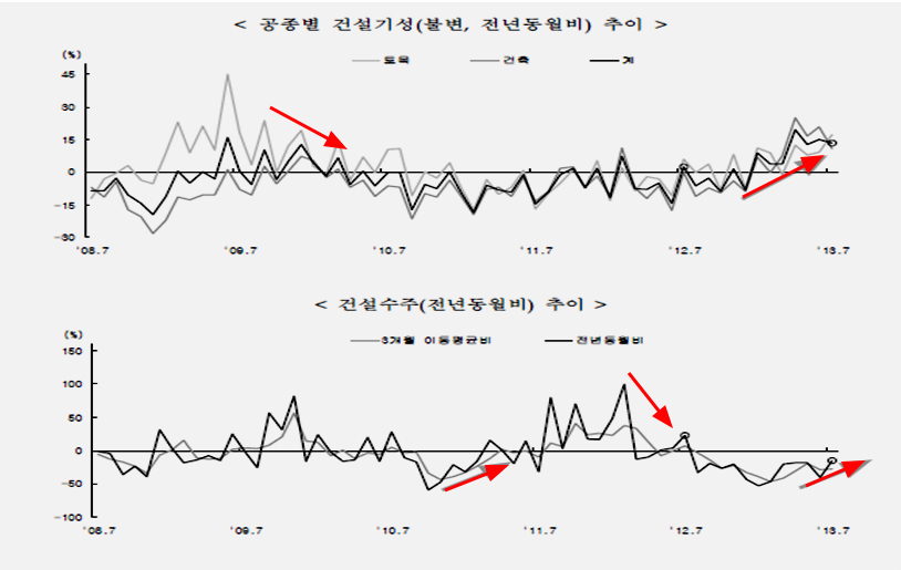 특기할 것은 건설업의 회복이다. 전년 동월비 증가율의 변화를 볼 때 건설공사 금액인 건설기성고는 2009년 하락 전환한 이후 2013년 이후 뚜렷한 증가세를 나타내고 있고, 건설수주 증가율은 2011년 하반기 감소 이후 최근 들어 개선 추세를 나타내고 있다.