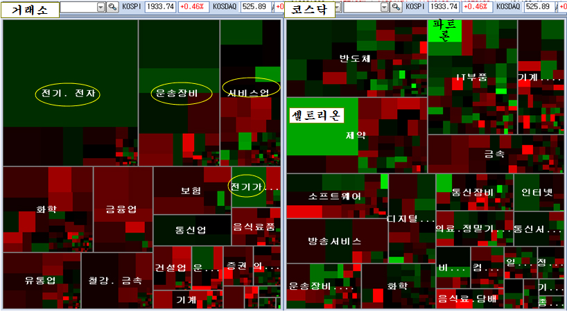 다음 시가총액에 면적이 비례하도록 그려진 등락지도를 보면 이런 상황을 한 눈에 알 수 있다 (빨강: 상승, 녹색: 하락, 검정:보합 농도:등락률)