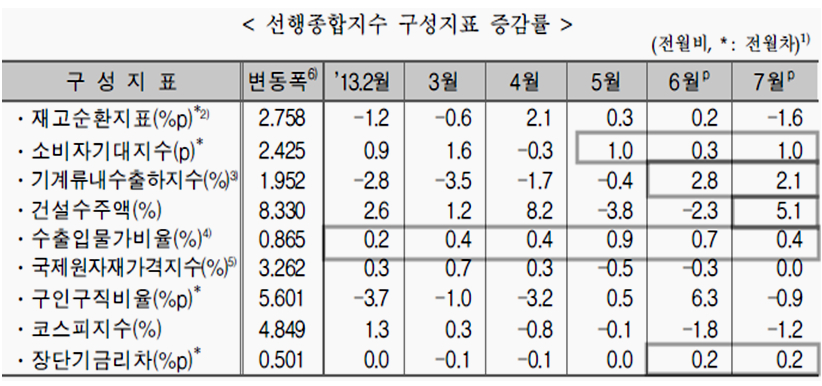 7월 산업생산은 여전히 정체 국면을 이어가고 있으나, 향후 경기를 예고하는 경기선행지수의 증가가 가속을 받으며 경기 회복을 예고하고 있다. 특히 선행지수 순환 변동치는 하반기 들어 뚜렷한 증가세로 전환되면서 향후 경기가 회복될 것임을 예고한다. 주가의 상승이 단순한 반등이 아니라 향후 경기 회복에 따른 기업 실적 호전을 바탕으로 하는 것임을 의미한다.
