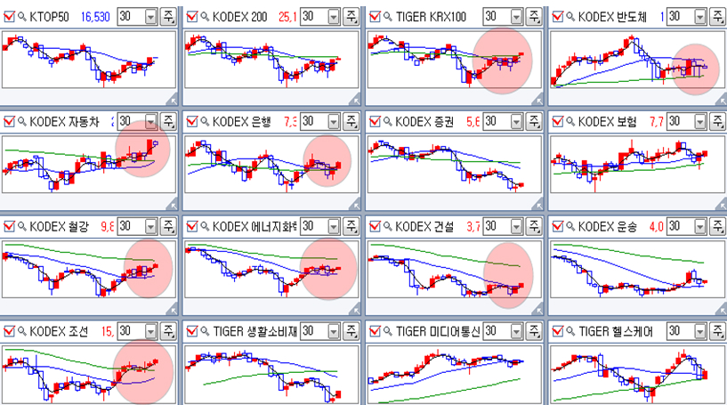 업종별 주가 흐름을 ETF 주가를 통해서 보면 다음과 같다. 주간 차트로 보는 경기 민감 업종은 20주 평균 위에서 충분한 힘을 비축한 후 20주 평균의 상승 전환과 함께 상승이 시작되는 모습이다.