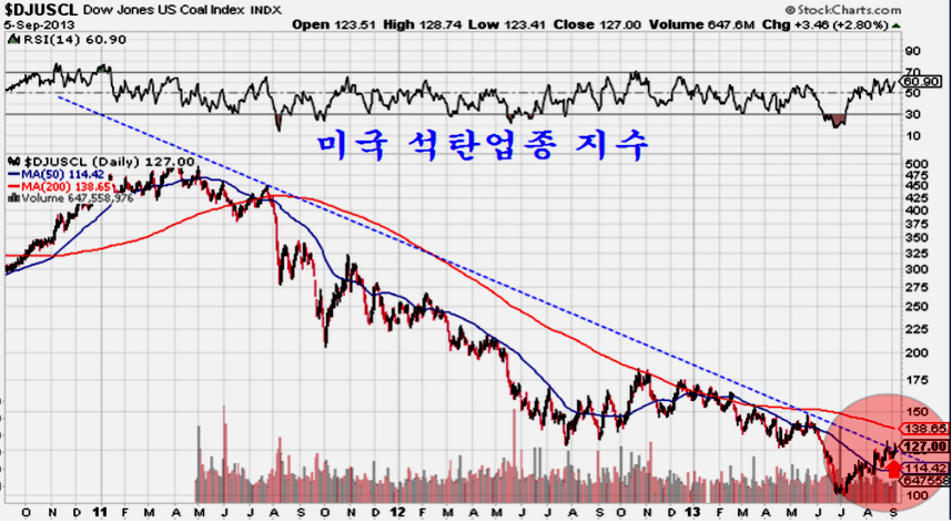 장기간 하락 추세를 이어 온 미국의 석탄업종 지수 역시 최근 꾸준한 상승을 하면서 2011년 이후의 하락 추세 저항을 돌파하는 전환점에 있다. 석탄은 발전소 연료 뿐 아니라, 시멘트와 철강을 만드는 핵심 원료이다. 따라서 석탄과 건화물 운임의 상승은 직접적으로는 광업, 석탄, 시멘트, 철강, 금속업의 활황 국면이 도래함을 의미하고, 다른 한편으로는 철강과 시멘트를 사용하는 건설과 토목 산업의 성장을 의미한다.