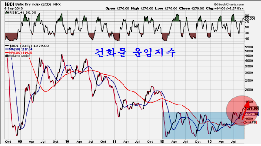 건화물 운임 지수는 2012년 초 호주의 홍수에 의한 철광석과 석탄의 수출이 중단되면서 급락을 거친 후 1200 아래에서 오래 침체되어 왔는데 최근 가파른 상승과 함께 이 장기 박스권을 돌파하는 강력한 상승 추세로 발전하고 있다. 그만큼, 석탄과 철광석의 수송이 많아진다는 것을 의미하며, 세계 산업재 경기의 활발한 회복 움직임의 전조이다.