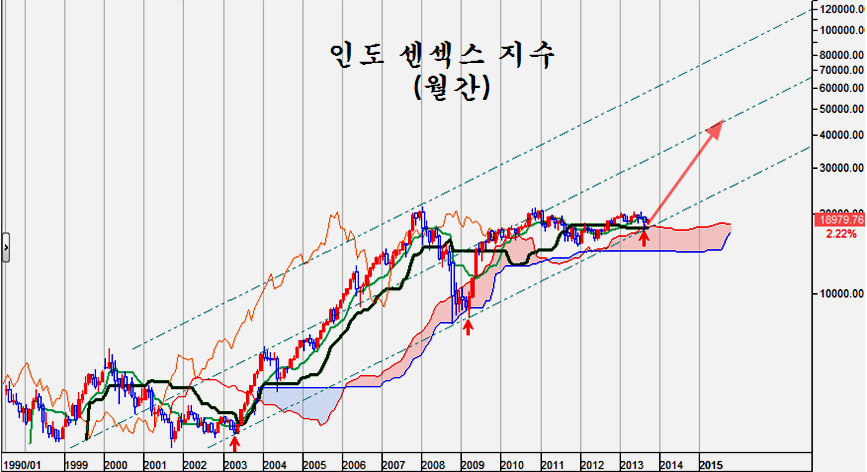 사실 맨 처음 신흥국 위기론이 불거진 나라는 인도이지만, 인도의 주가지수를 월봉에 일목균형표를 더해서 보면 2003년과 마찬가지로 절호의 매수 포인트가 되어 있으며, 주가에 위기의 징후는 전혀 없다.