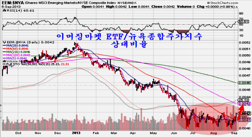 이런 흐름 때문에 이머징마켓 ETF를 뉴욕종합주가지수로 나눈 상대비율을 보면 2013년 이후 이머징마켓이 상대적으로 급락하여 과도한 저평가를 이룬 후 하반기 들어 두달여에 걸친 진통을 거치며 매집을 한 후 (이 때