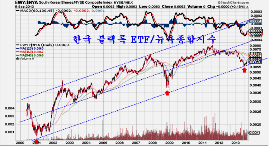 블랙록의 한국 펀드 ETF 를 뉴욕종합주가지수로 나눈 상대비율의 변화를 보면 분명 2002년이나 2009년처럼 분명한 전환이 일어나고 있다. 즉, 미국증시가 올라야 한국이 오르는 것이 아니라 한국증시가 먼저 오르고 뉴욕증시가 오르는 국면으로 전환이 되어 있다. 따라서, 앞으로는 미국의 투자자들이 한국 시장을 보면서 저녁시간을 보내는 일이 많아진다.