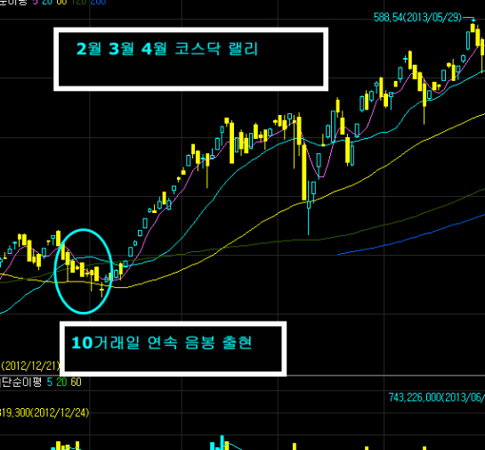 위 챠트는 코스닥이 올 상반기 랠리를 하기전 지점에서 어떤 모양을 하고 띄웠는가를