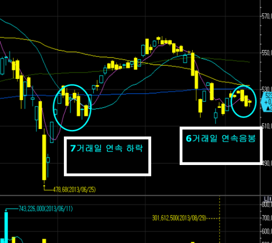상반기 랠리전처럼 10거래일 연속 음봉을 만들어 내고 나서 움직일 소지도 높다.