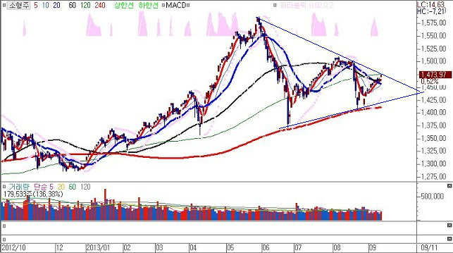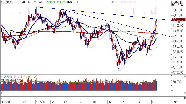 또한 상단에서 내려오는 하락 추세대를 돌파한 상황이나- 두가지 강한저항-즉,하락추세대와 대량매물대를 돌파함에 큰 힘을 소진하고 있다 판단되는바 움직이는 모든것은 에너지를 소진하고 나면 반드시 에너지의 축적기간을 가져야한다는것을 생각해볼때 대형주의 경우는 경기에 민감한 핵심 종목이외의 대형주의 경우 기존 보유자의 경우는 일시 매도의 기회를 포착해야할것으로 보여지며
