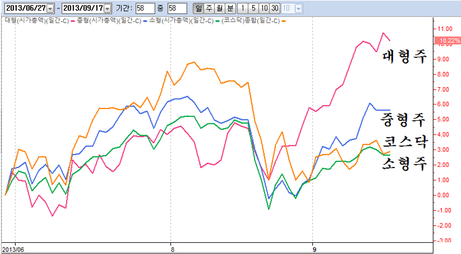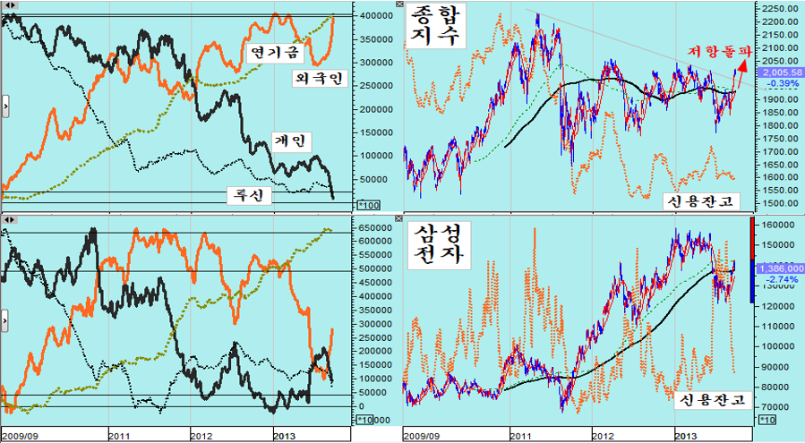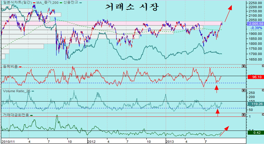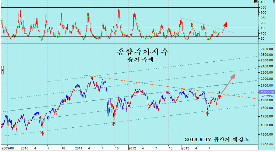 8월 23일 이후 외국인이 공격적으로 주식을 매수한 이후 9월 선물 만기를 기점으로 주가가 2011년 이후의 장기 조정 추세의 추세 저항선을 돌파함으로써 2년간의 긴 조정을 마치고 본격적인 상승 추세를 시작하는 모습으로 나타나고 있다. 2011년 4월 고점과 2012년 고점을 잇는 저항 추세가 돌파되고 이제 추세선을 새로운 바닥으로 하여 상승 추세가 준비되고 있다.