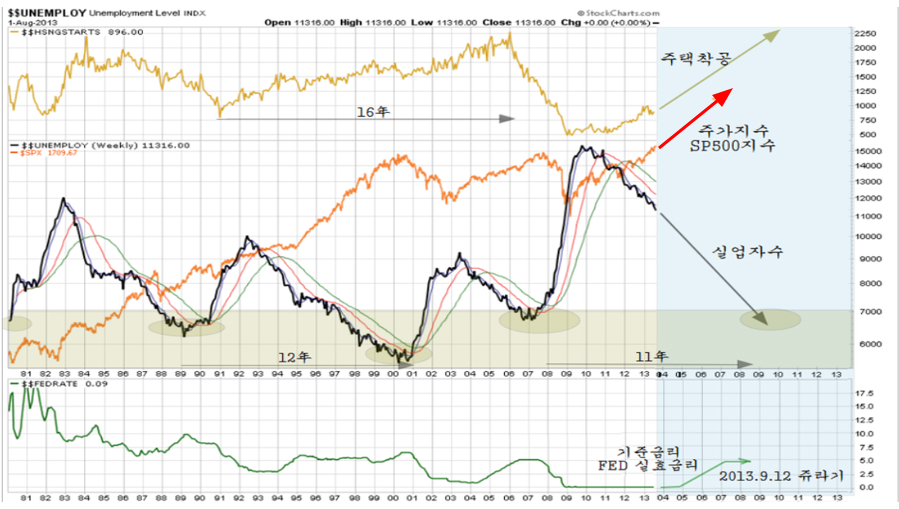 다음은 미국의 17년 주기의 변동을 하는 주택착공과, 그에 따른 실업자수의 변동, 그리고 주가지수 (S&P500지수) 및 FRB의 기준금리 예상도를 2020년까지 그린 것이다. 즉, 미래의 모습을 그려 본 것이다.